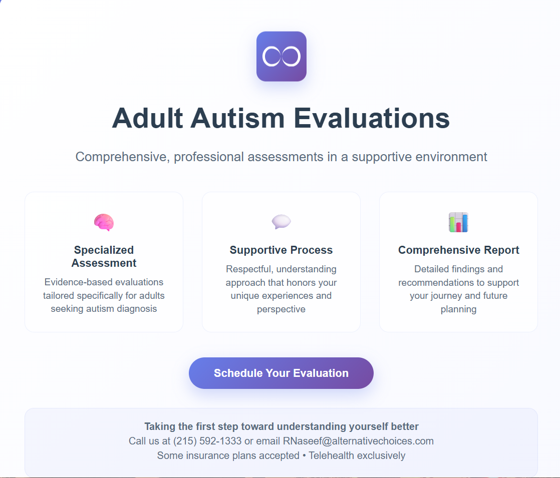 Since 1990, Alternative Choices has been an independent psychology practice with a team of experienced, licensed psychologists and psychotherapists. Our mission is to build authentic therapeutic partnerships to bring about change, healing, and growth for adults, including those who are neurodivergent or autistic. Treatment and evaluation strategies are tailored to address each person's unique needs in a safe confidential space for individuals to explore their thoughts and feelings without fear of judgment or disclosure. This can allow you to gain insight and understanding of your emotions and behaviors and can lead to reduced symptoms of anxiety, depression, and other mental health conditions, such as trauma.